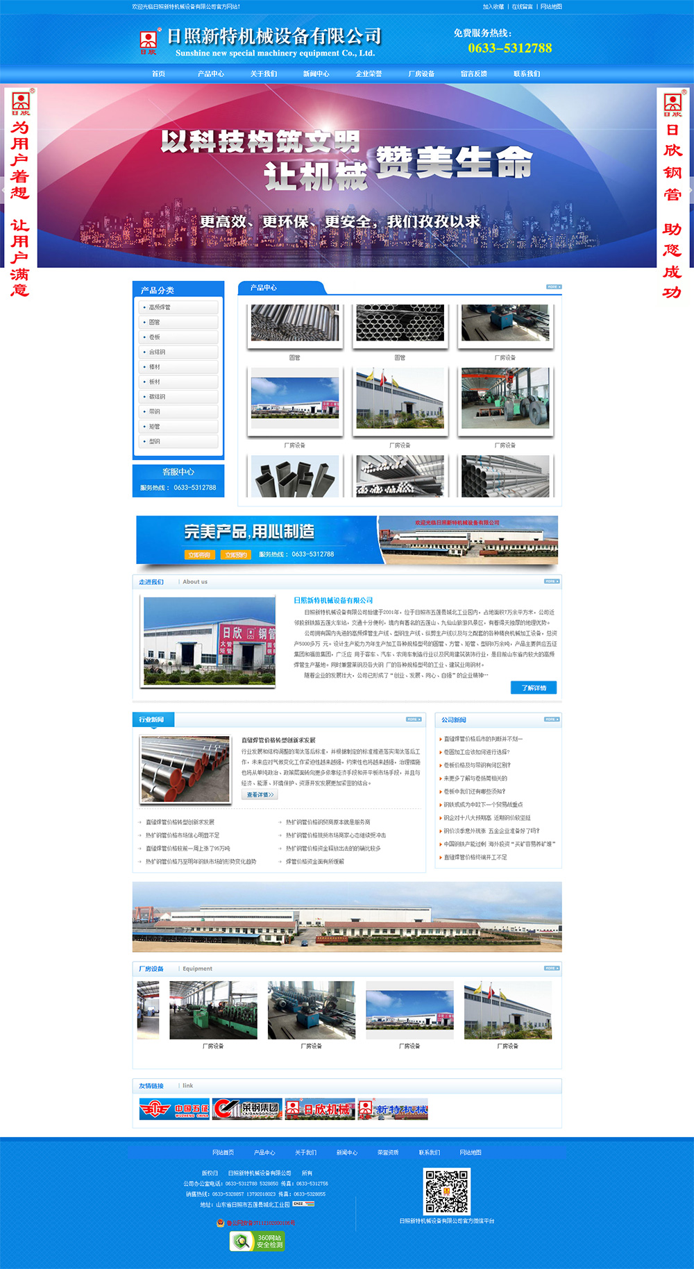• 日照新特機械設(shè)備有限公司始建于2001年,位于日照市五蓮縣城北工業(yè)園內(nèi),占地面積7萬余平方米,公司近鄰膠新鐵路五蓮火車站,交通十分便利,境內(nèi)有著名的五蓮山、九仙山旅游風(fēng)景區(qū),有著得天獨厚的地理優(yōu)勢。 公司擁有國內(nèi)先進的高頻焊管生產(chǎn)線、型鋼生產(chǎn)線、縱剪生產(chǎn)線以及與之配套的各種精良機械加工設(shè)備,總資產(chǎn)5000多萬元。設(shè)計生產(chǎn)能力為年生產(chǎn)加工各種規(guī)格型號的圓管、方管、矩管、型鋼8萬余噸,產(chǎn)品主要供應(yīng)五征集團和福田集團,廣泛應(yīng)用于客車、汽車、農(nóng)用車制造行業(yè)以及民用建筑裝飾行業(yè),是目前山東省內(nèi)較大的高頻焊