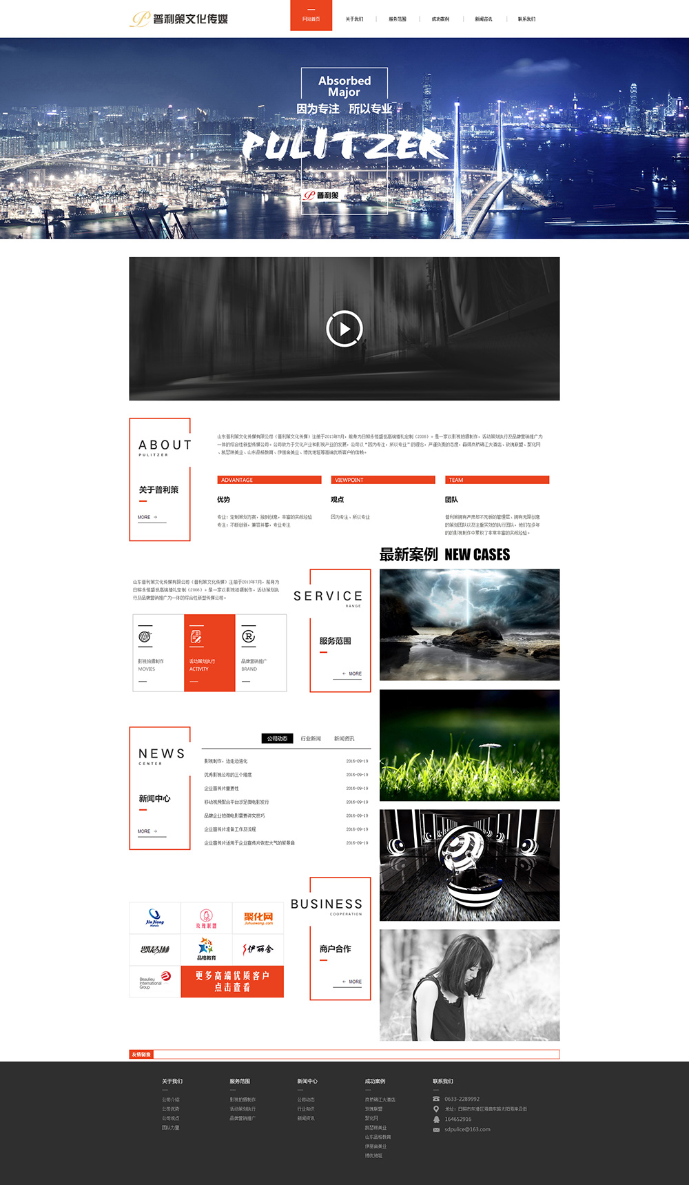 • v山東普利策文化傳媒有限公司(普利策文化傳媒)注冊于2013年7月,前身為日照永 恒盛世高 端婚禮定制(2008)。是一家以影視拍攝制作,活動策劃執(zhí)行及品牌營銷推廣為一體的綜合性新型傳媒公司。公司下置:策劃部,市場部,影視部及設計部四個部門。注冊3年來,致力于文化產(chǎn)業(yè)和影視產(chǎn)業(yè)的發(fā)展,公司以“因為專 注,所以專 業(yè)”的理念,嚴謹負責的態(tài)度,獲得了廣大 客戶的贊許和好評。